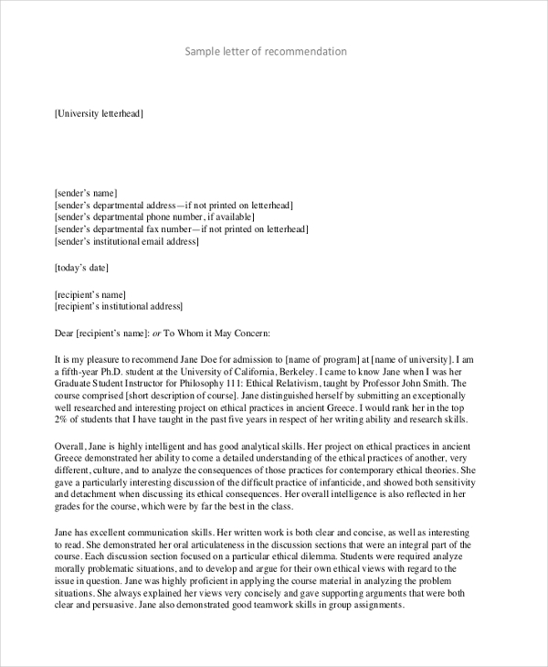 | Free 6 Sample Letter Of Recommendation |